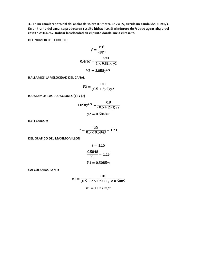 3.- En un canal trapezoidal del ancho de solera 0.5m y talud Z=0.5, circula un caudal de 0.8m3/s.