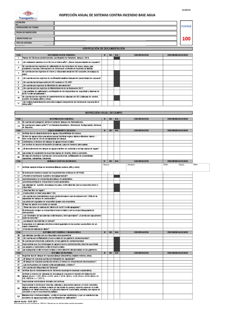 INSPECCIN ANUAL DE SISTEMAS CONTRA INCENDIO BASE AGUA