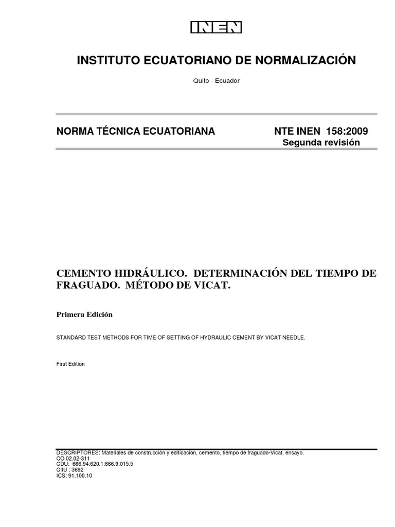 Norma Tcnica Ecuatoriana NTE INEN 159 Cementos. Determinacin del tiempo de fraguado.