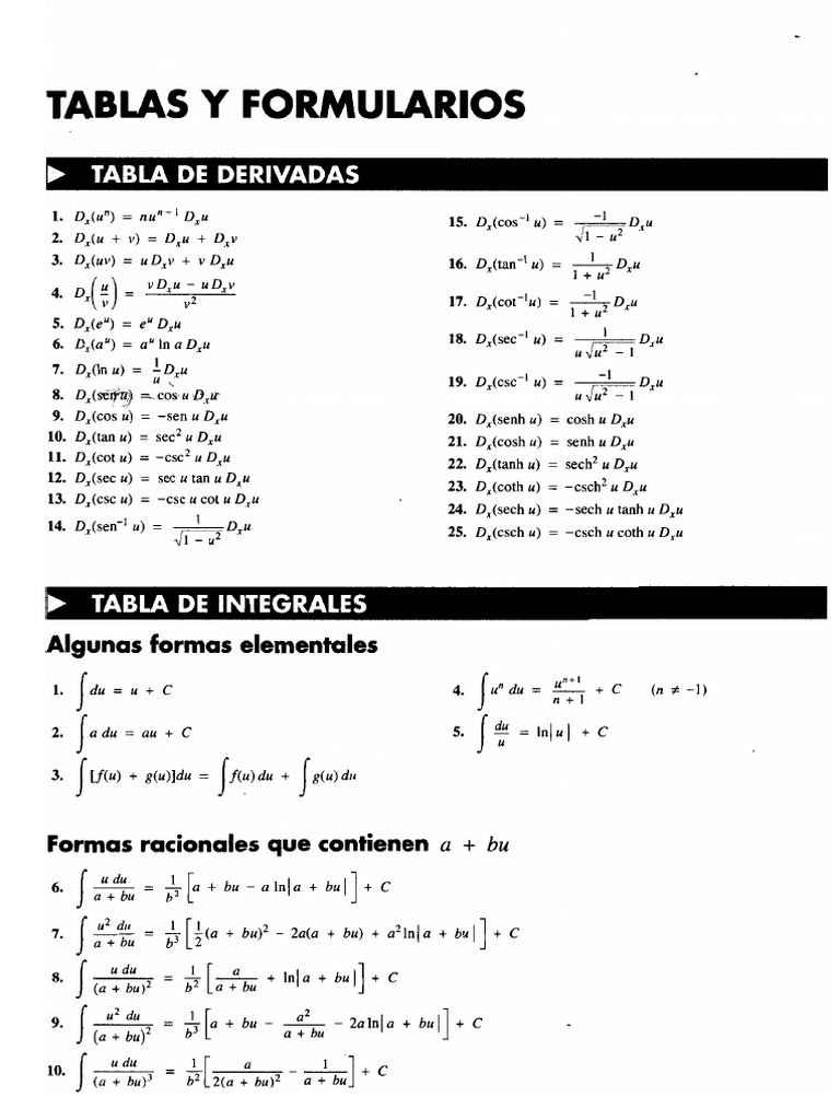 TABLAS Y FORMULARIOS LL. Dyu") = nw"! Du oe 2 Du + v) = Du + Dy 3. D,(uv) = uDyv + v Dy 16. D,fanly = ee v7. oycor'n = <5 5. Die") =e Daw 6 D,a") = a"ina Du 18. Dy(see"! w) = 7. Dinu) 19. Dose w sen u Dy 20. D,(senh u) = cosh u Deu sec? u Du 21. D,(cosh u) = senh u Du wesc? u Dw 22, D,(tanh uw) = sech? u Dyu 23, D,(coth w) = ~esch? u Du 24, D,(sech u) = ~sech u tanh u Du Dw 25. D,(esch u) = -csch u coth u Du ae a cess Algunas formas elementales sec w tan u Dy ese ucotu Du u fawuse af 2 [adem ave 5 fae min +c a fuw + swoldu fra + fro 6 i du Flat bu ~ainfa + bul Joc 2 tee rt 2 ER = pz + bw? - rata + bw) + aPinja + bu) | +c [fae + le + owl] +c a + bu ee 7 oe . laa tar atm] : id ee [a+ bw = 2 ~ datnja + bul] +c : =u. 2 1B. dus Ayp|_# | wat ~ tata *¢ att Bight bul oc Bott 7 ae 1" en Lay dial me c a+ bu? * wat bu) * a?” |* Formas que contienen ./a + bu 4, 15, 16. 17. 18, 19. 21. 2. ua > bu du = wom = aya + bu)? + C lata du = 2-156? - 2 WEE d= {Ses (SHU? — VRabu + Baya + bw)? + 2u"(a + buy'/? 2an ee ears one) fever + Bi udu 2 = -— ... a z w? du 2 yy? 2} cee 2 apt — dat + 802) JET + C Jar be ~ i5e*° a udu _ "Jae bu 2am va + bu b(2n +1) b2Qn+ VD) ya + bu sia>0 ula + bv +C siac0 du ~ -_va¥ bu du wat bu an = Dut la bu va + bu du = 2a + bu oof ua vas bu du _ _ (a+ buy"? _ o(an - 5) [ Ya ¥ bu du a" a(n — WuT ~ Zan = 1) Formas que contienen a? + 12 Lat tec 7 qin e+e si |ul