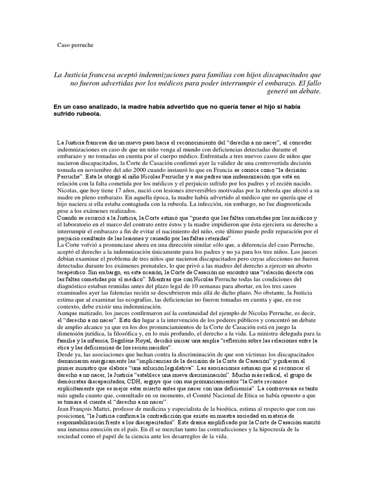 Perruche. Esta le otorg al nio Nicolas Perruche y a sus padres una indemnizacin que est en