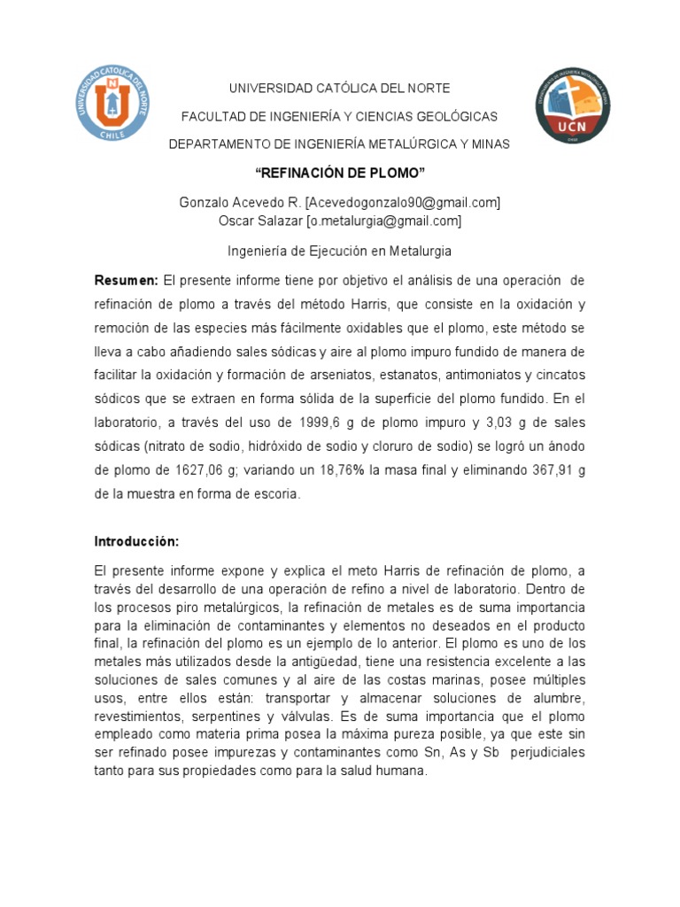 El presente informe expone y explica el meto Harris de refinacin de plomo, a