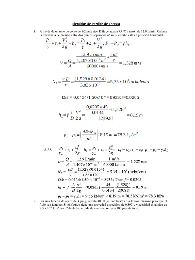 1. A travs de un tubo de cobre de 1/2 pulg tipo K fluye agua a 75 C a razn de 12.9 L/min. Calcule
