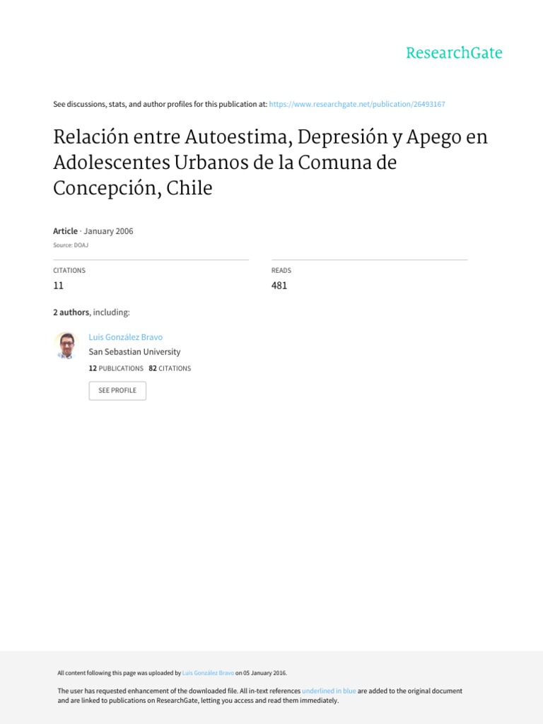 Se investig la relacin entre autoestima, apego y depresin en 164 adolescentes urbanos de la comuna de