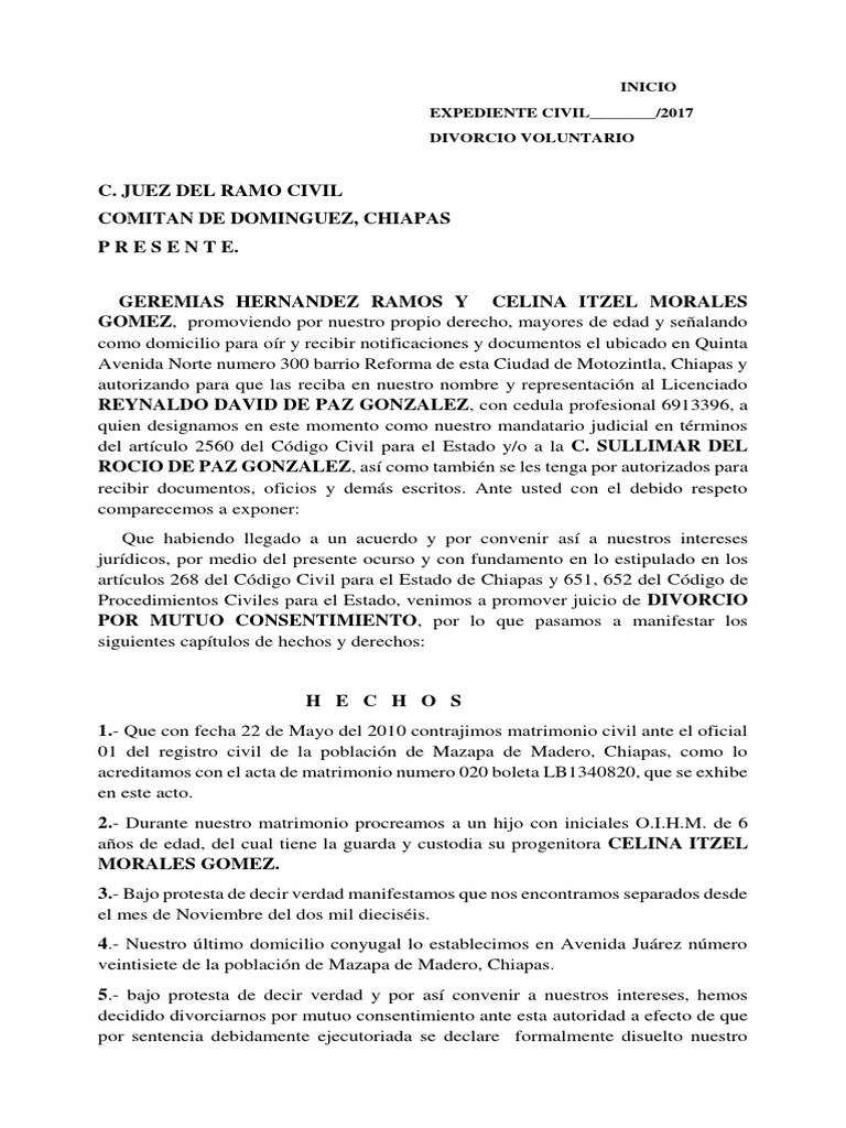 Procedimientos Civiles para el Estado, venimos a promover juicio de DIVORCIO