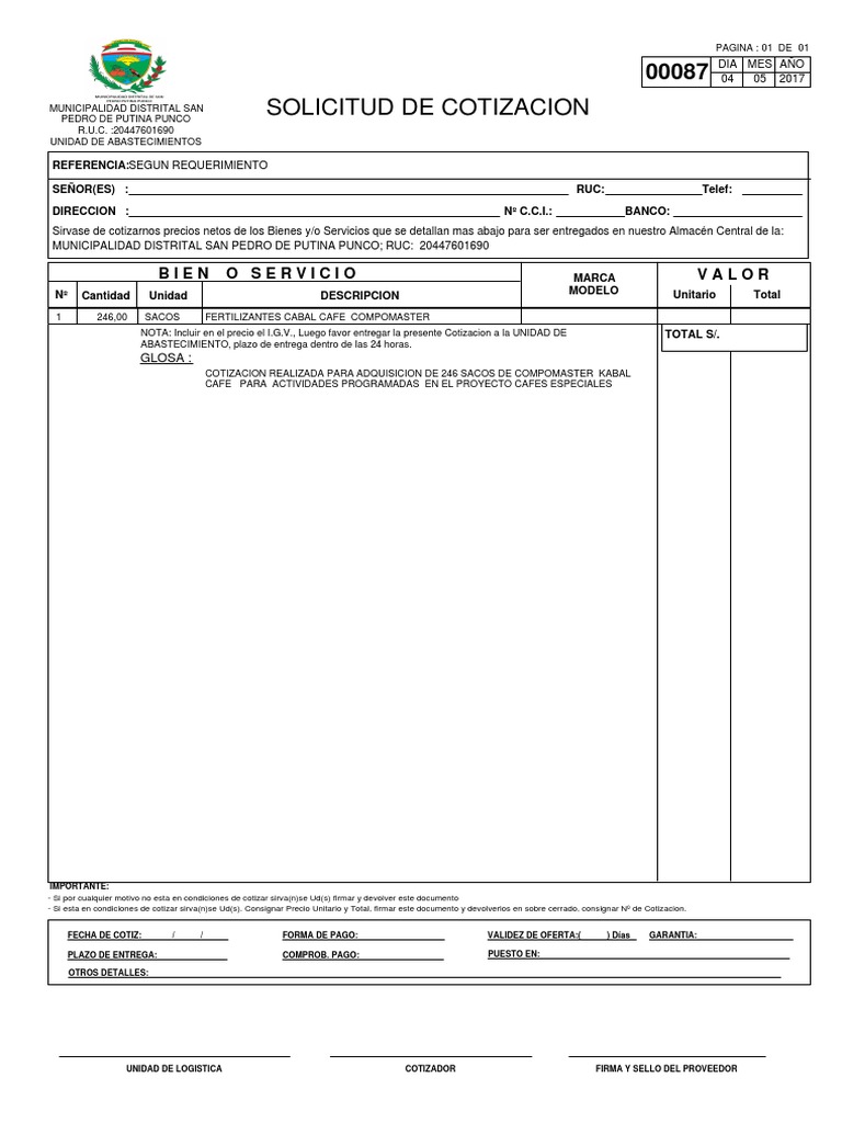 COTIZACION REALIZADA PARA ADQUISICION DE 246 SACOS DE COMPOMASTER KABAL