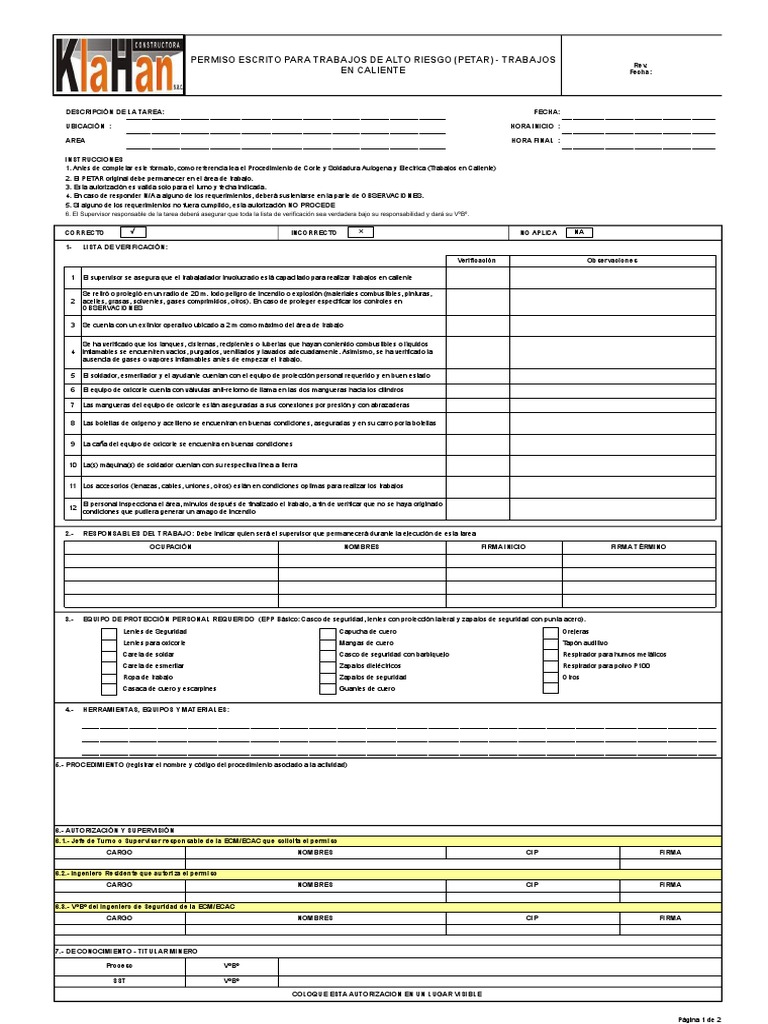 1. Antes de completar este formato, como referencia lea el Procedimiento de Corte y Soldadura Autogena y Electrica (Trabajos en Caliente)