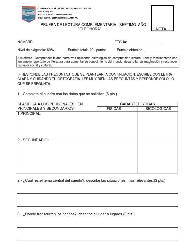 PRUEBA DE LECTURA COMPLEMENTARIA SEPTIMO AO