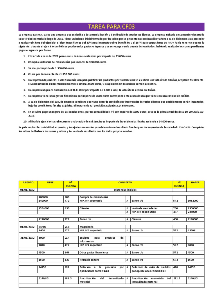 Se pide realizar la contabilidad expuesta, y los ajustes necesarios para determinar el resultado fina despus de impuestos de la sociedad LAVACA SA. Completar