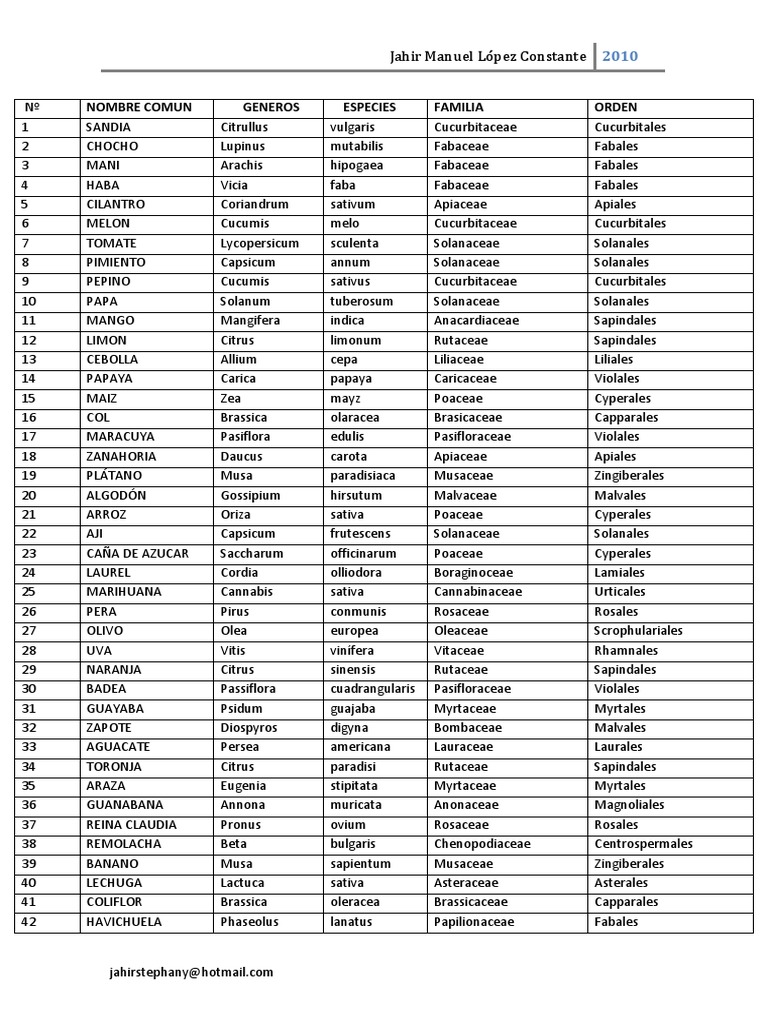 N NOMBRE COMUN GENEROS ESPECIES FAMILIA ORDEN
