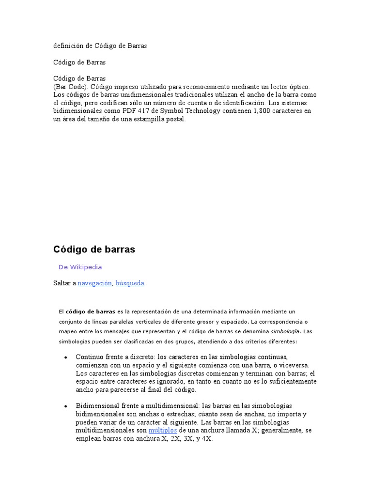 (Bar Code). Cdigo impreso utilizado para reconocimiento mediante un lector ptico.