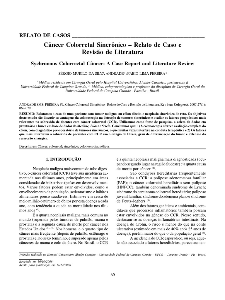 ANDRADE SMS; PEREIRA FL. Câncer Colorretal Sincrônico - Relato de Caso e Revisão de Literatura. Rev bras Coloproct, 2007;27(1):