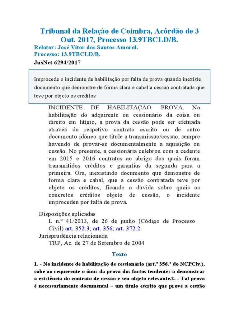1. - No incidente de habilitação de cessionário (art.º 356.º do