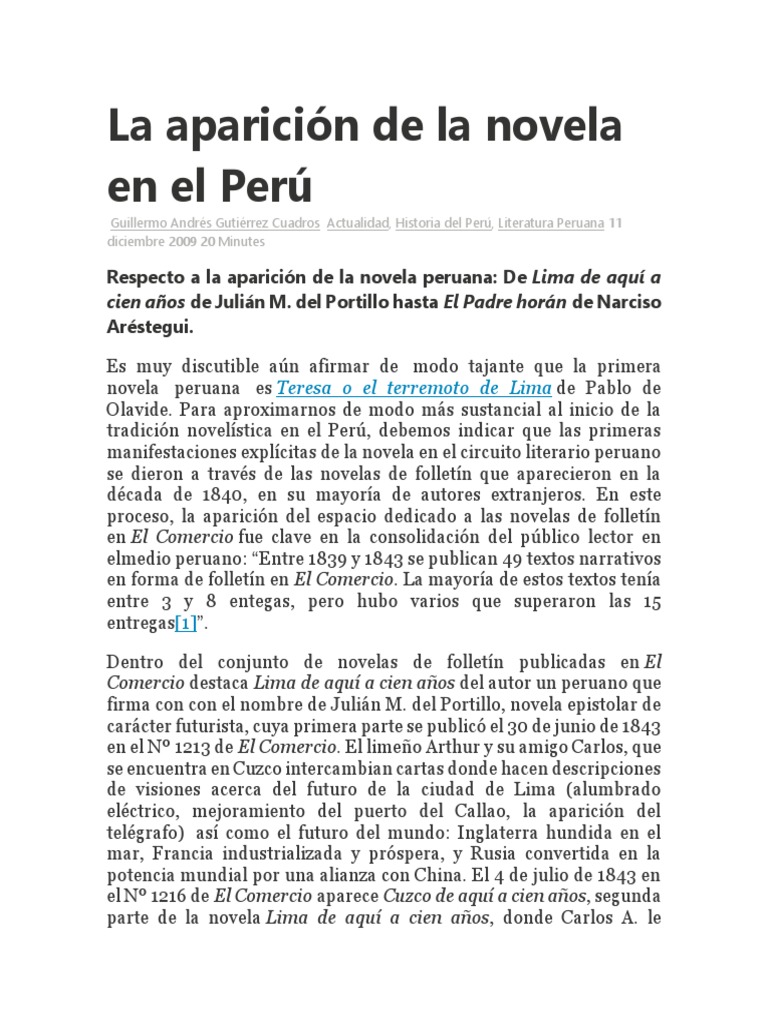Respecto a la aparición de la novela peruana: De Lima de aquí a