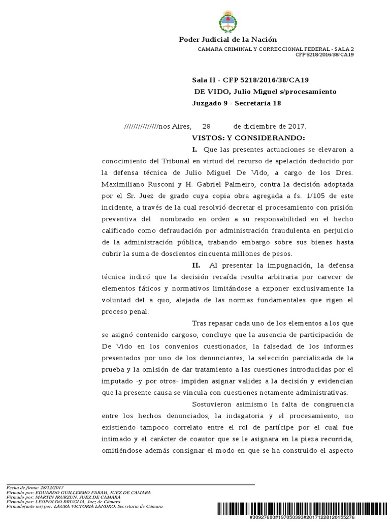 preventivo que pesa sobre Julio Miguel de Vido, corresponde remitirme al