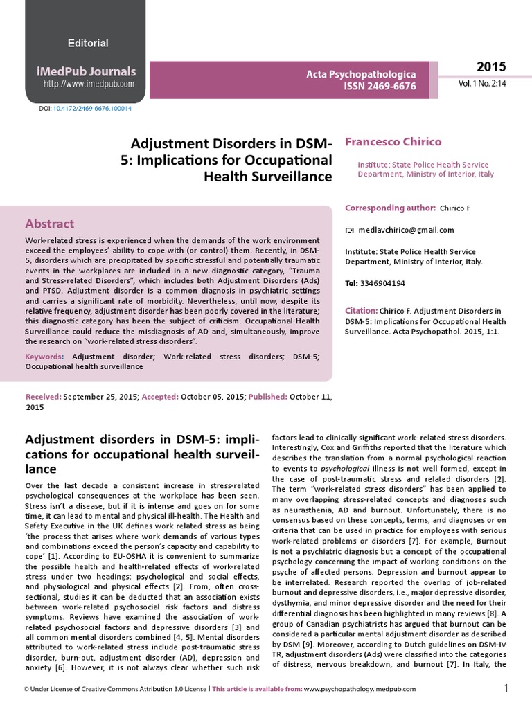 0 License 3 . 1 No. clinical examination and SCID-5. simultaneously. occupational health improve the research on “work-related mental disorders”. 2015 Acta Psychopathologica ISSN 2469-6676 Vol. 2:14 (expert in work organization) and the third step psychiatric and diagnosis based on aetiology and outcome [24]. This procedure psychological examination [11. because AD is a longitudinal © Under License of Creative Commons Attribution 3. This latter phase needs both could reduce the misdiagnosis of AD and. surveillance can give an advantage. 12]. Moreover.