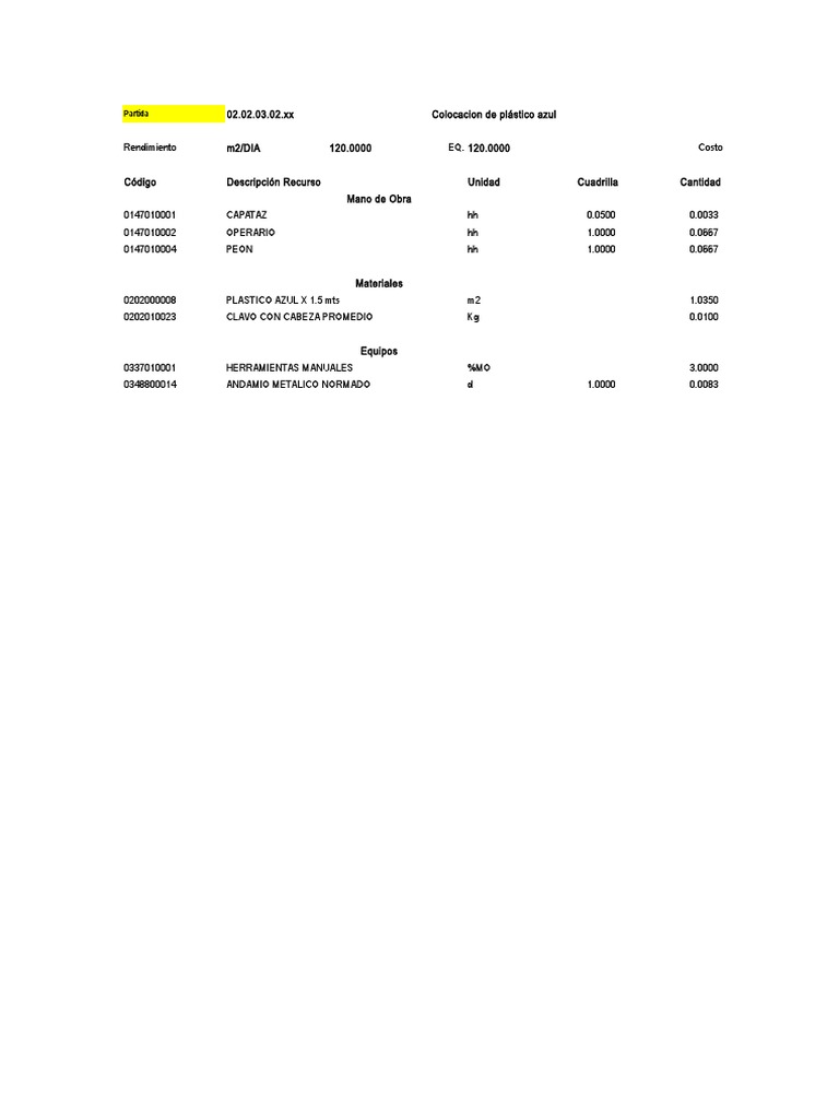 Rendimiento m2/DIA 120.0000 EQ. 120.0000 Costo unitario directo por : m2