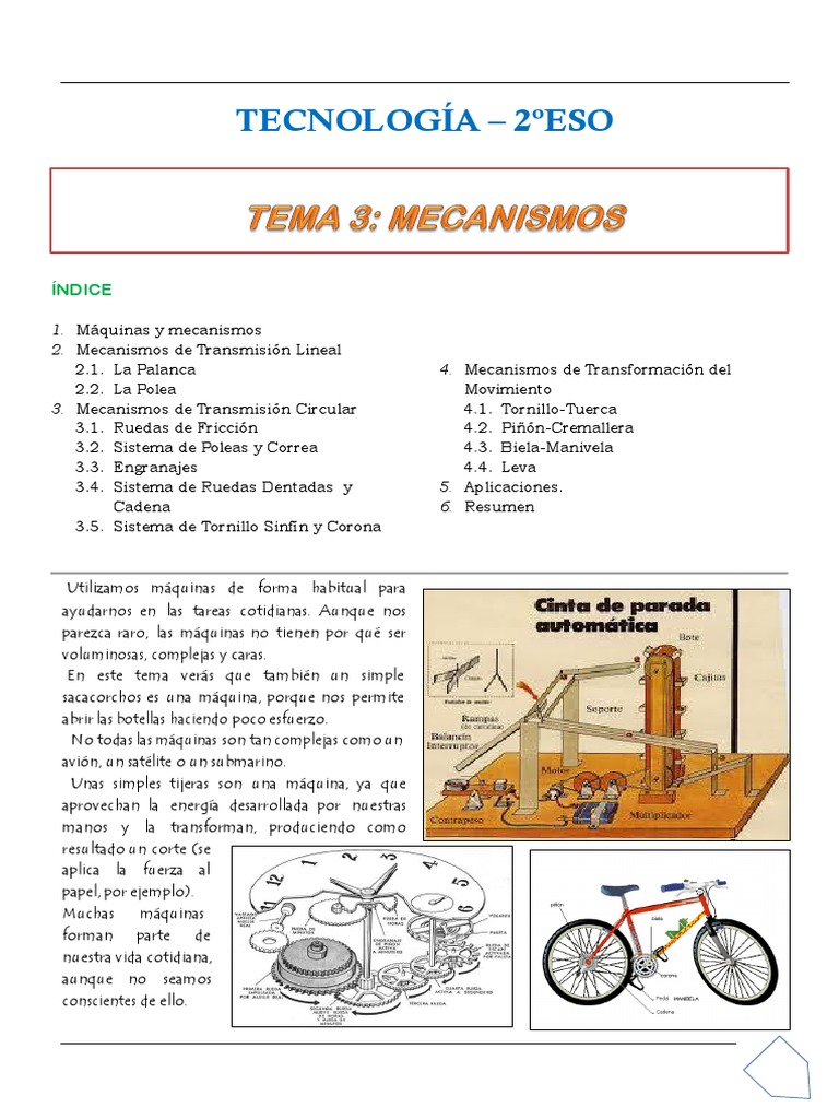 Estudiaremos las principales máquinas simples así como los mecanismos que se encargan de