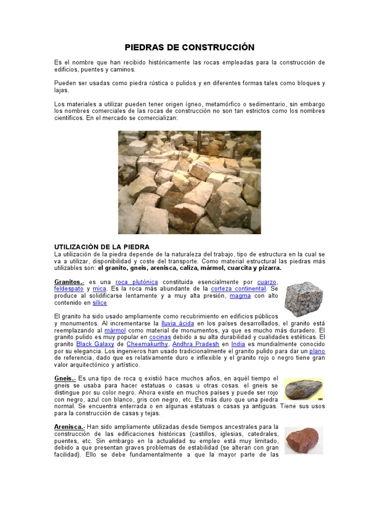 utilizables son: el granito, gneis, arenisca, caliza, mármol, cuarcita y pizarra.