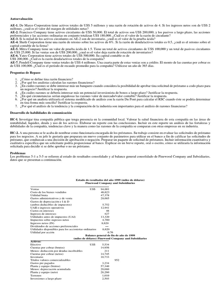 Los problemas 5-1 a 5-5 se refieren al estado de resultados consolidado y al balance general consolidado de Pinewood Company and Subsidiaries,