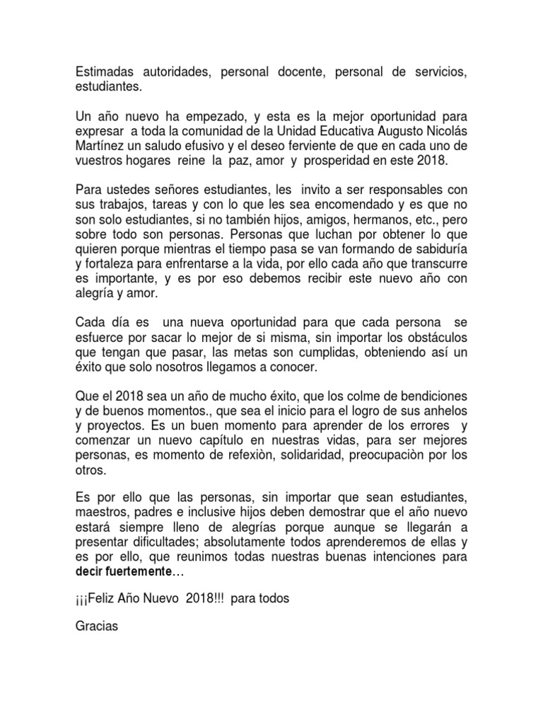 expresar a toda la comunidad de la Unidad Educativa Augusto Nicolás