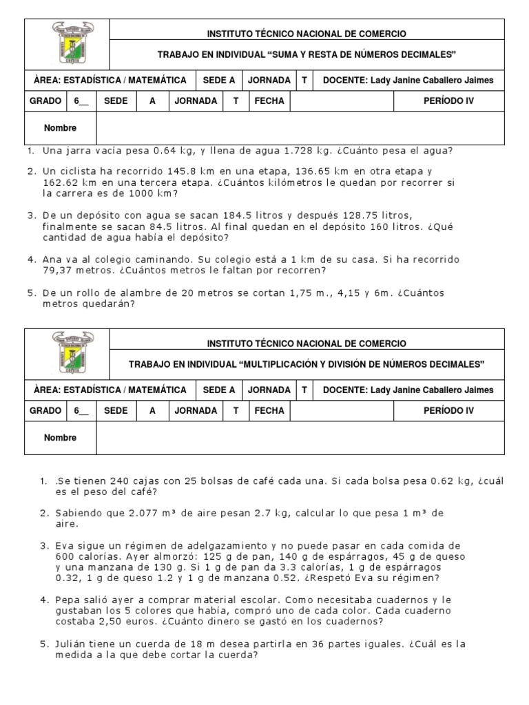 TRABAJO EN INDIVIDUAL “MULTIPLICACIÓN Y DIVISIÓN DE NÚMEROS DECIMALES”