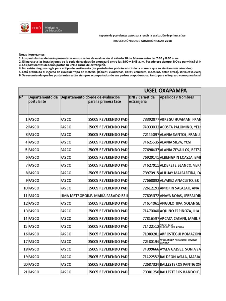 Reporte de postulantes aptos para rendir la evaluación de primera fase