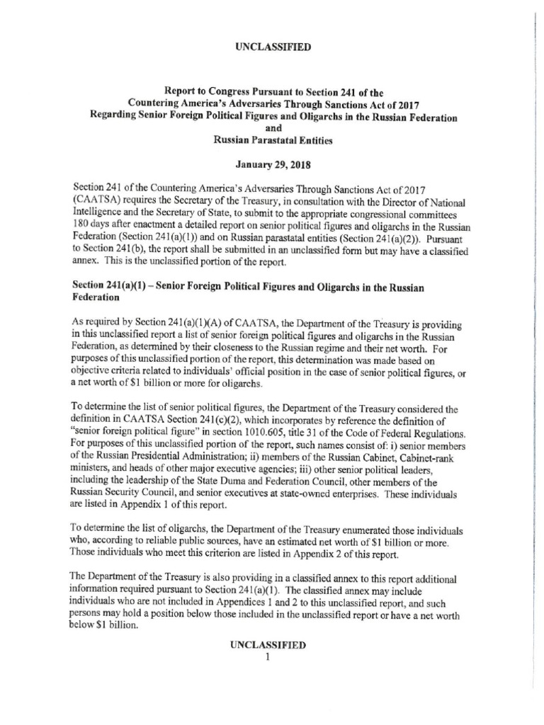 As required by Section 241(a)(1)(A) of CAATSA, the Department of the Treasury is providing