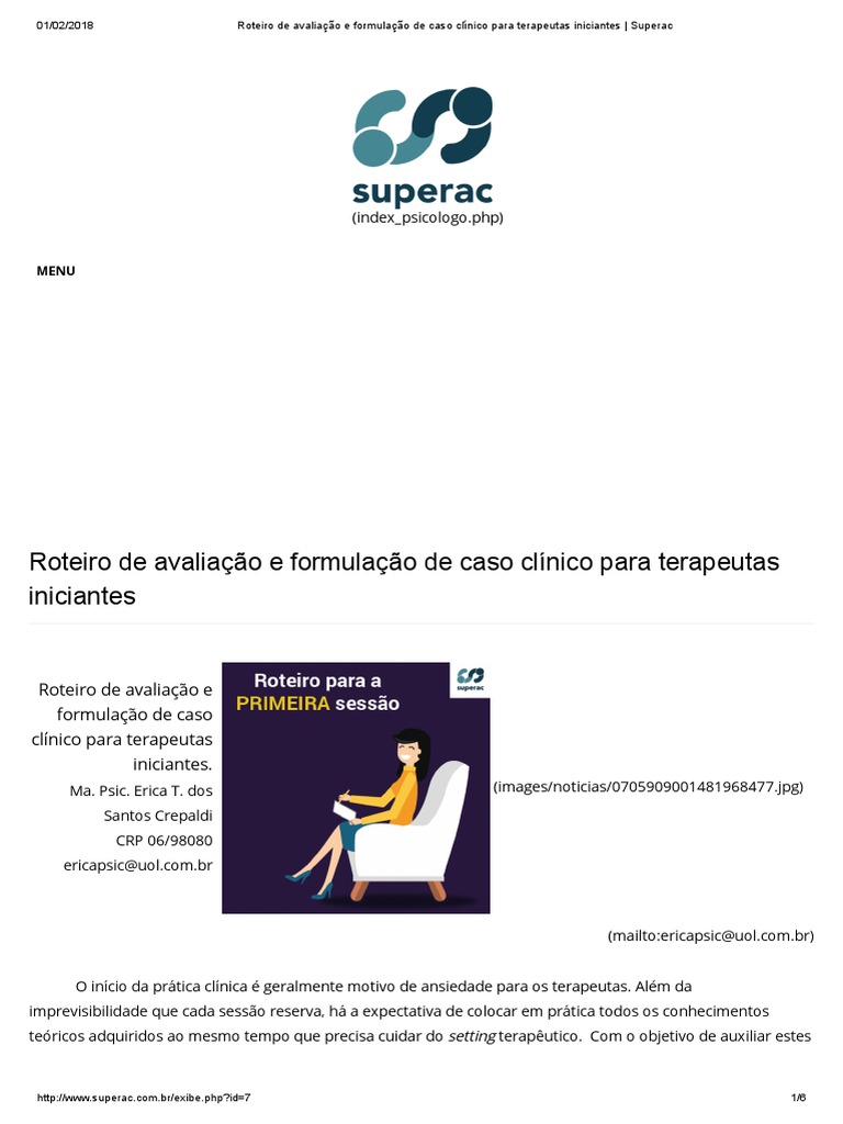 01/02/2018 Roteiro de avaliação e formulação de caso clínico para terapeutas iniciantes | Superac (https://www.facebook.br/). Desenvolvido por StrikeOn (http://www.br/exibe.php?id=7 6/6 .com/Superac-Supervis%C3%B5es-em-An%C3%A1lise-do-Comportamento- 511964588928728/) Copyright Superac 2016 | Todos os direitos reservados.strikeon. http://www.superac.com.com.
