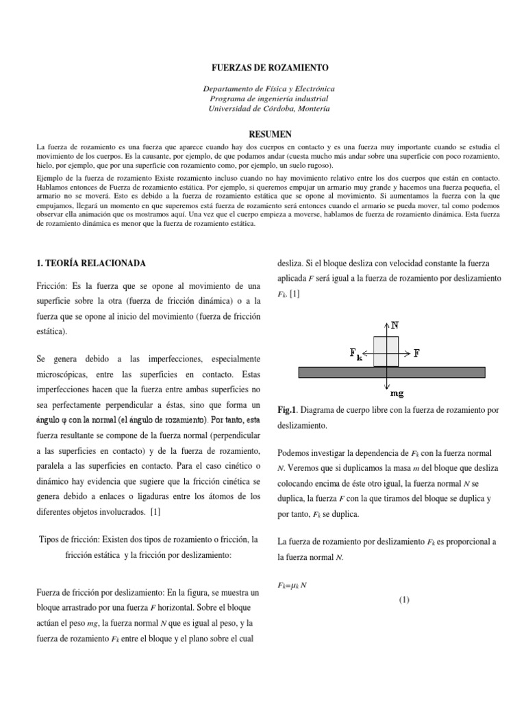 La fuerza de rozamiento es una fuerza que aparece cuando hay dos cuerpos en contacto y es una fuerza muy importante cuando se estudia el