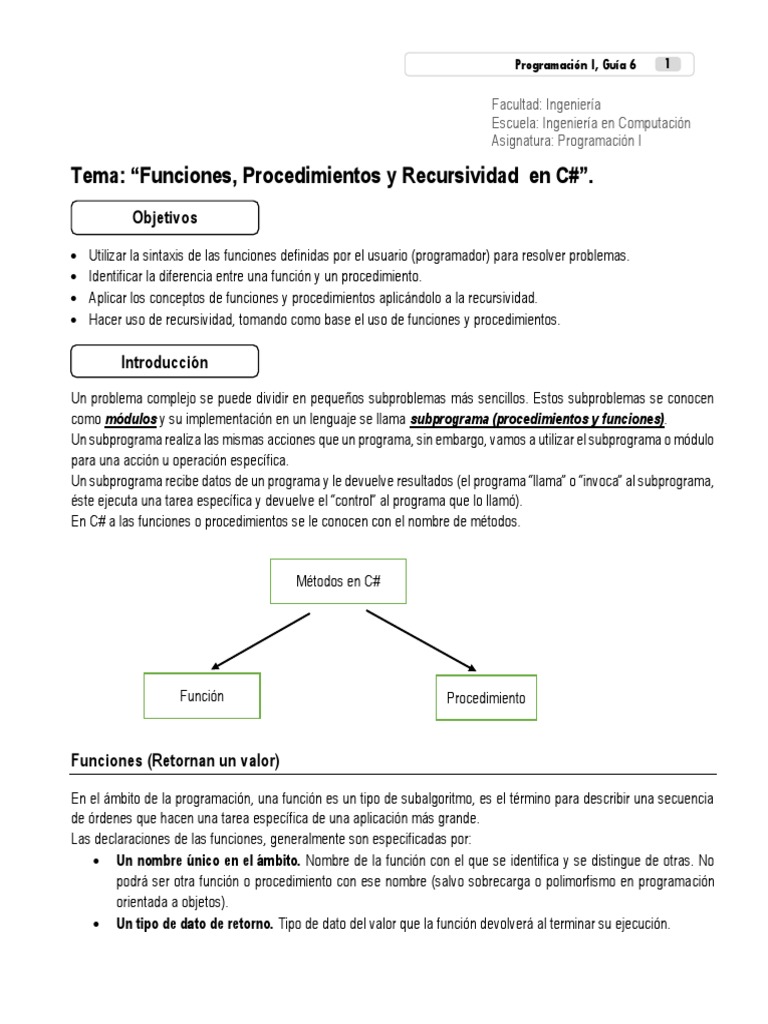 Tema: “Funciones, Procedimientos y Recursividad en C#”.