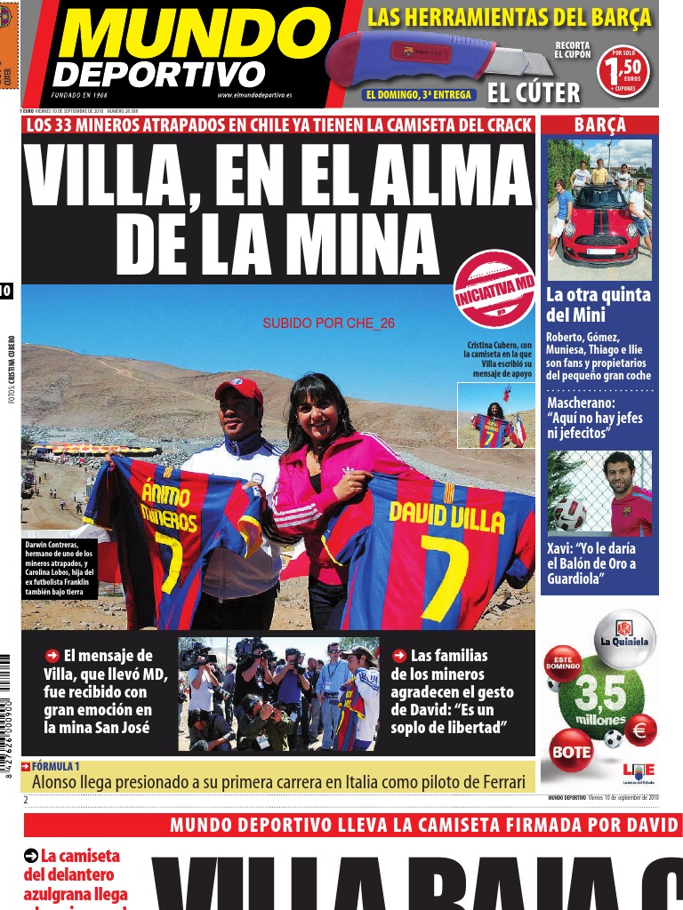 MD LLEVA LA CAMISETA FIRMADA POR DAVID VILLA A LOS MINEROS CHILENOS SEPULTADOS