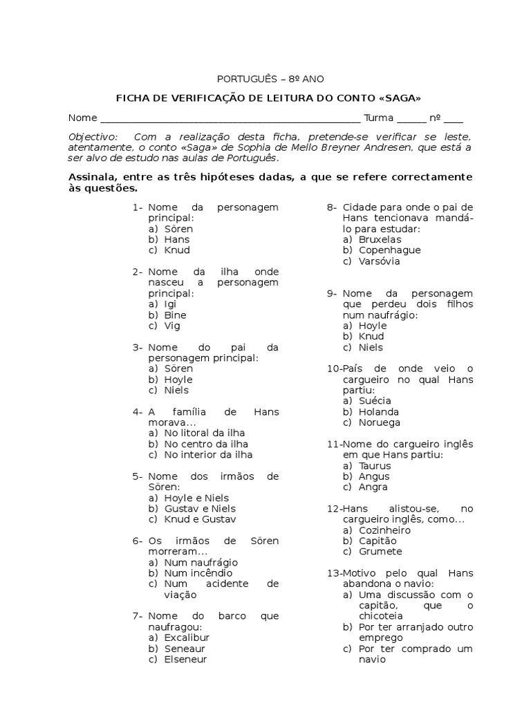 principal: Hans tencionava mandá- a) Sören lo para estudar: b) Hans a) Bruxelas c) Knud b) Copenhague c) Varsóvia 2- Nome da ilha onde nasceu a personagem principal: 9- Nome da personagem a) Igi que perdeu dois filhos b) Bine num naufrágio: c) Vig a) Hoyle b) Knud 3- Nome do pai da c) Niels personagem principal: a) Sören 10-País de onde veio o b) Hoyle cargueiro no qual Hans c) Niels partiu: a) Suécia 4- A família de Hans b) Holanda morava… c) Noruega a) No litoral da ilha b) No centro da ilha 11-Nome do cargueiro inglês c) No interior da ilha em que Hans partiu: a) Taurus 5- Nome dos irmãos de b) Angus Sören: c) Angra a) Hoyle e Niels b) Gustav e Niels 12-Hans alistou-se, no c) Knud e Gustav cargueiro inglês, como… a) Cozinheiro 6- Os irmãos de Sören b) Capitão morreram… c) Grumete a) Num naufrágio b) Num incêndio 13-Motivo pelo qual Hans c) Num acidente de abandona o navio: viação a) Uma discussão com o capitão, que o 7- Nome do barco que chicoteia naufragou: b) Por ter arranjado outro a) Excalibur emprego b) Seneaur c) Por ter comprado um c) Elseneur navio 14-Lugar onde Hans dormiu c) Uruguai ao chegar à cidade: a) Hotel 23-Nome da esposa de Hans: b) Bancos de jardim a) Clara público b) Ana c) Casa de amigos c) Sophia