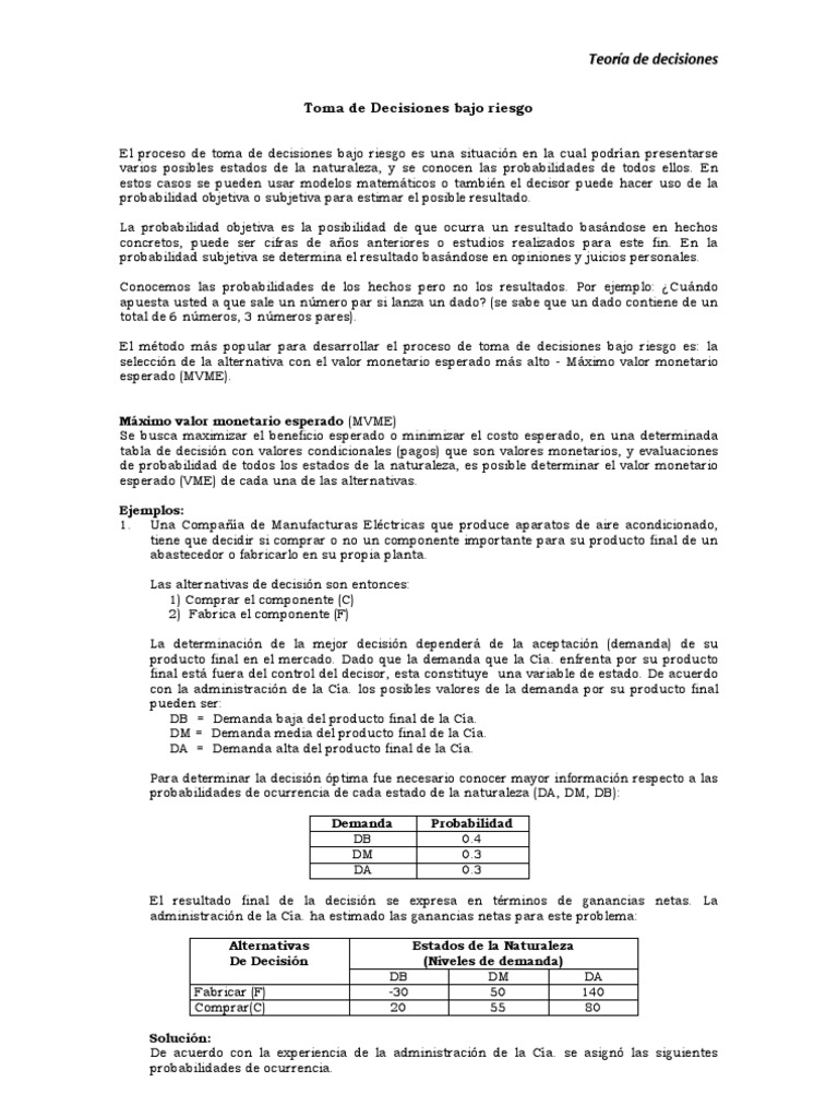 El proceso de toma de decisiones bajo riesgo es una situación en la cual podrían presentarse
