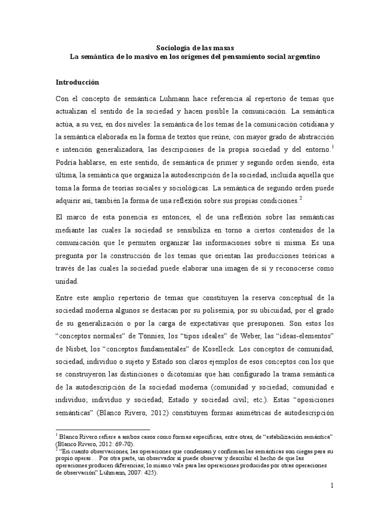 autodescripciones de la modernidad. Es el concepto de masa/s o sus equivalentes