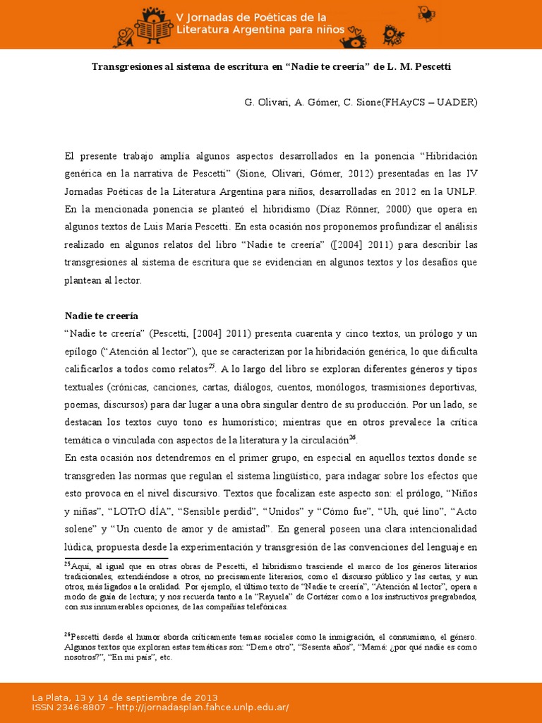 genérica en la narrativa de Pescetti” (Sione, Olivari, Gómer, 2012) presentadas en las IV