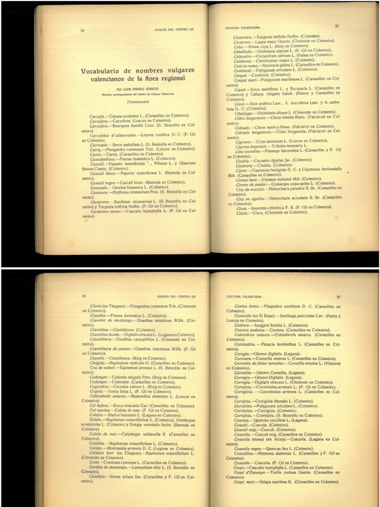 Voces valencianas vegetales. Publicadas por Luis Pardo Garcia (1897-1958) en Anales del Centro de Cultura Valenciana. Enero-Abril 1931