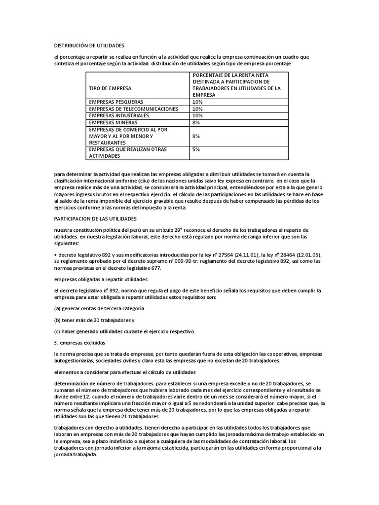 sintetiza el porcentaje según la actividad. distribución de utilidades según tipo de empresa porcentaje