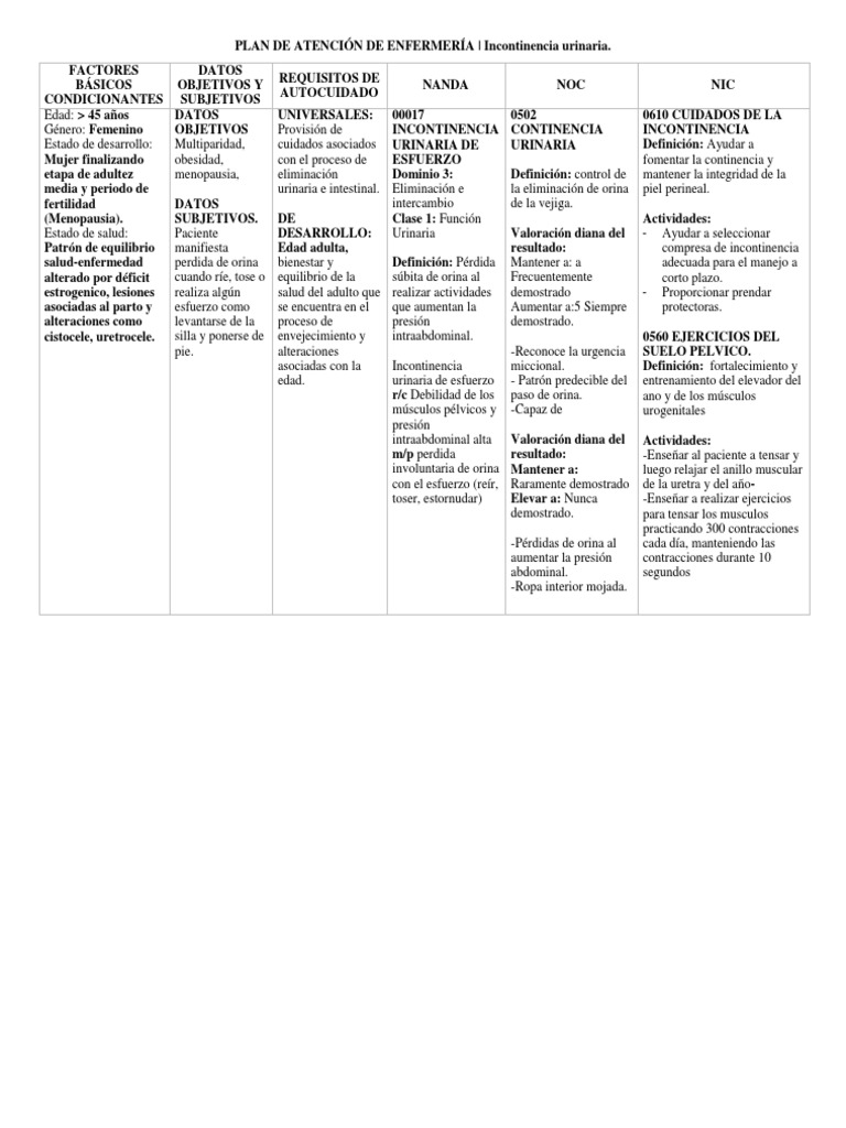 PLAN DE ATENCIÓN DE ENFERMERÍA | Incontinencia urinaria.