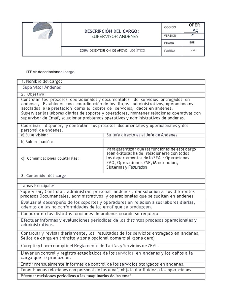 a) Supervisión: Su jefe directo es el Jefe de Andenes