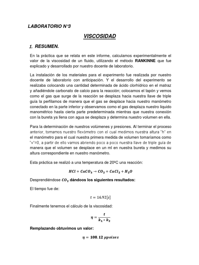 valor de la viscosidad de un fluido, utilizando el método RANKINNE que fue