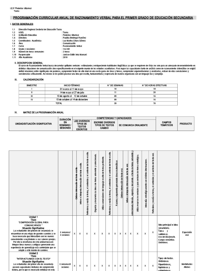 PROGRAMACIÓN CURRICULAR ANUAL DE RAZONAMIENTO VERBAL PARA EL PRIMER GRADO DE EDUCACIÓN SECUNDARIA