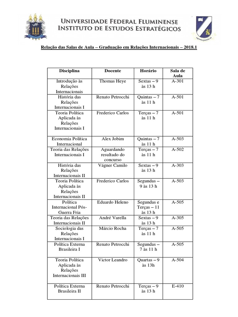 Relação das Salas de Aula – Graduação em Relações Internacionais – 2018.1