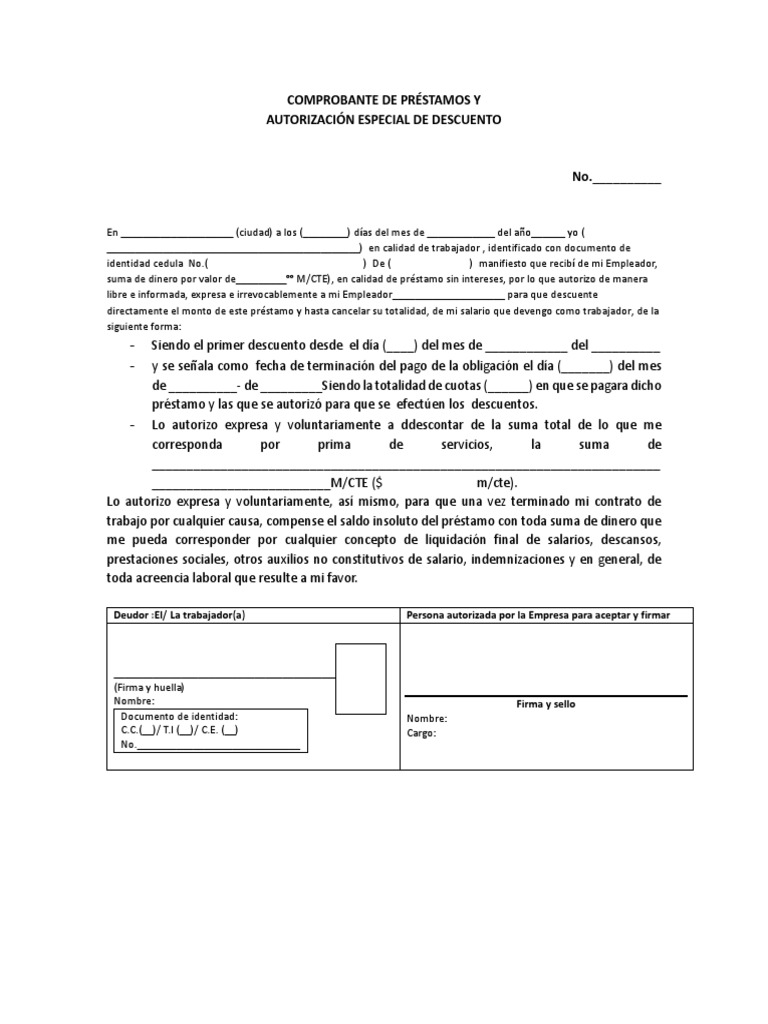 suma de dinero por valor de_________°° M/CTE), en calidad de préstamo sin intereses, por lo que autorizo de manera