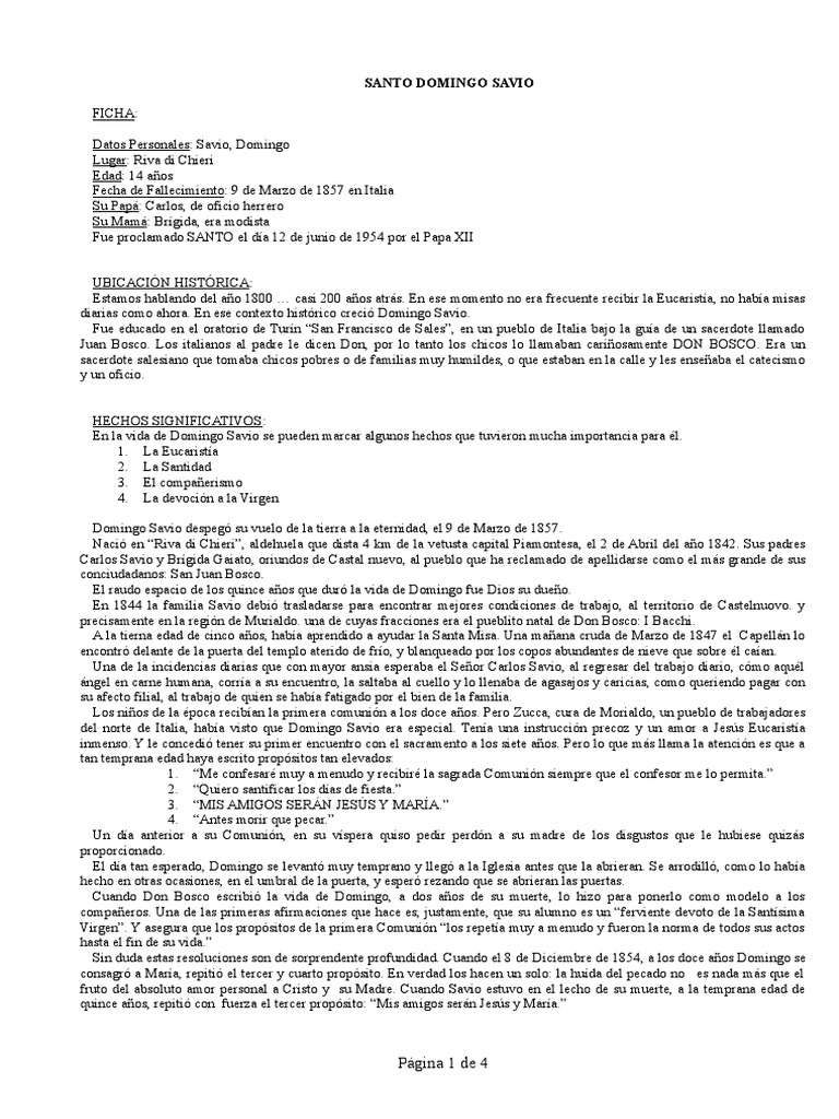 del norte de Italia, había visto que Domingo Savio era especial. Tenía una instrucción precoz y un amor a Jesús Eucaristía