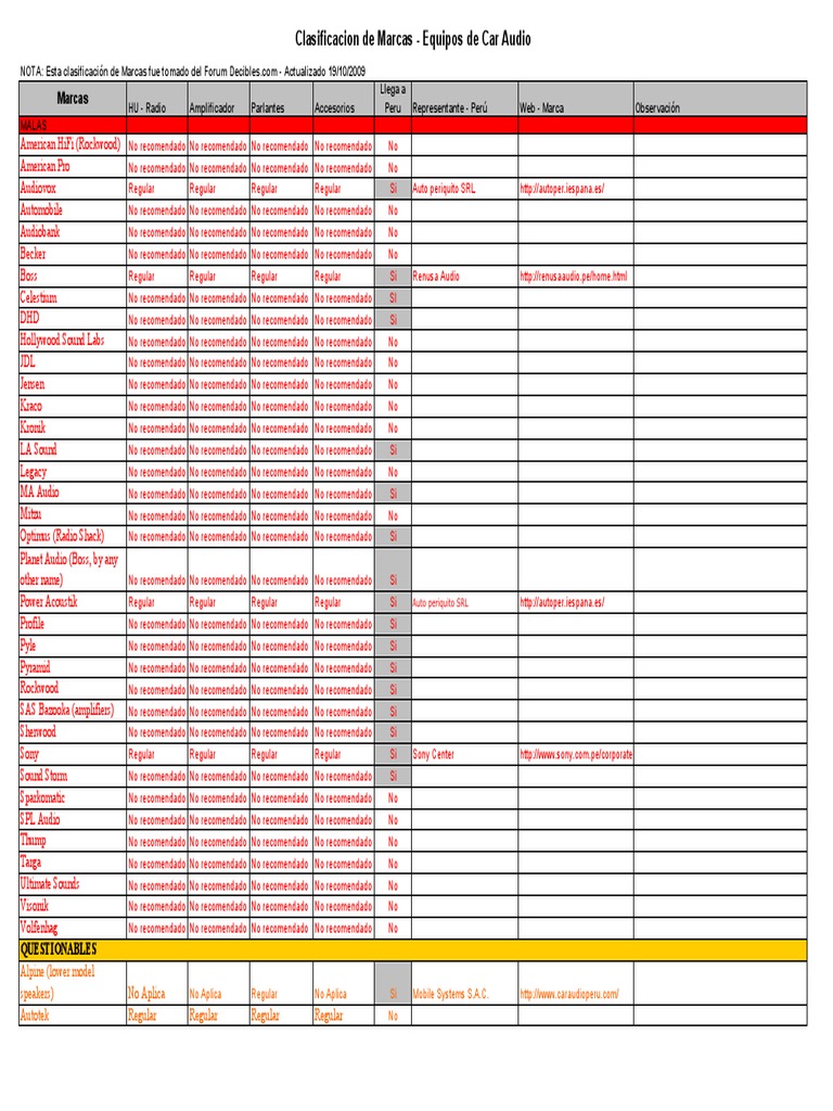 NOTA: Esta clasificación de Marcas fue tomado del Forum Decibles.com - Actualizado 19/10/2009