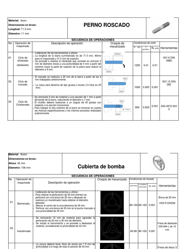 No. Operación de Croquis de mecanizado Condiciones de fresado