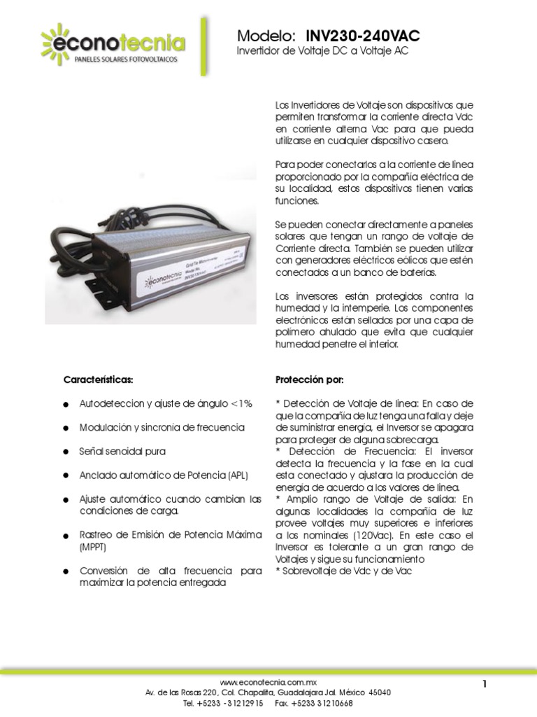 Voltaje Salida AC 240 Vca (190-260Vca) 50/60Hz 220W