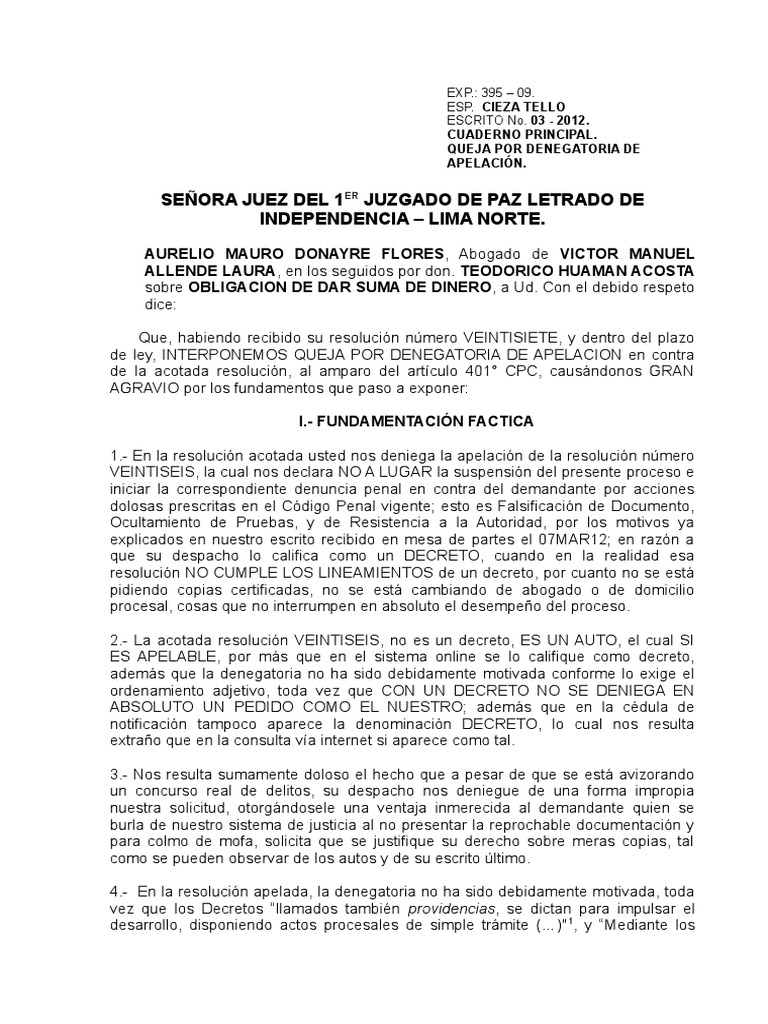 de ley, INTERPONEMOS QUEJA POR DENEGATORIA DE APELACION en contra
