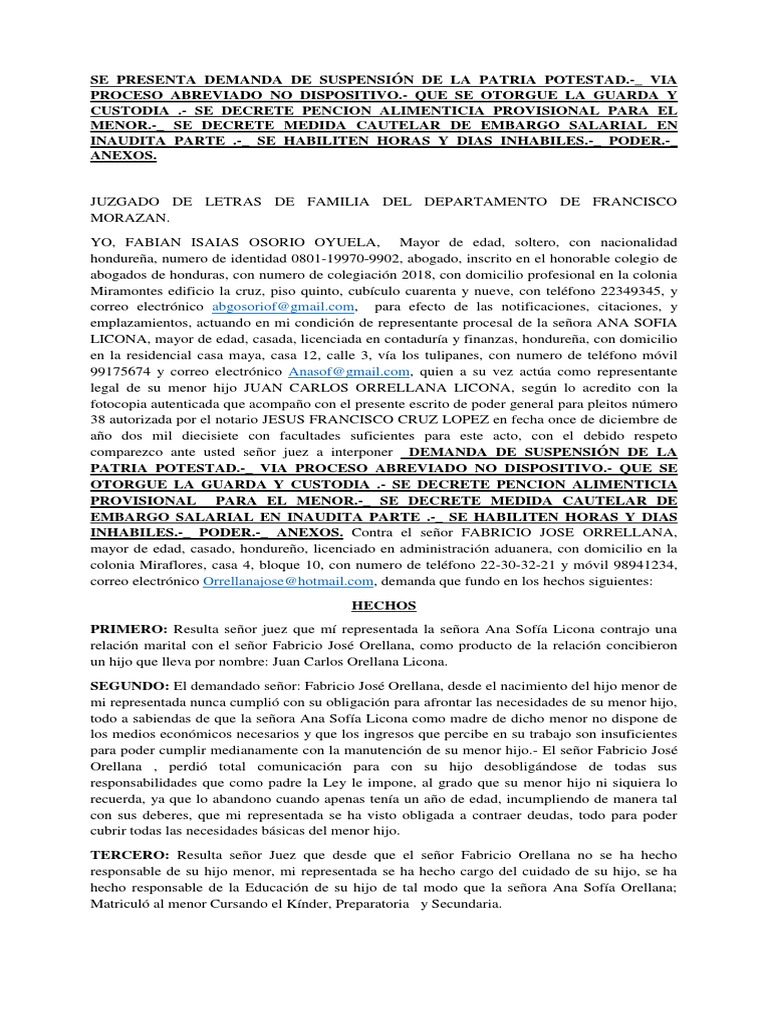 hijo JUAN CARLOS ORELLANA LICONA, presentado demanda de Suspensión de
